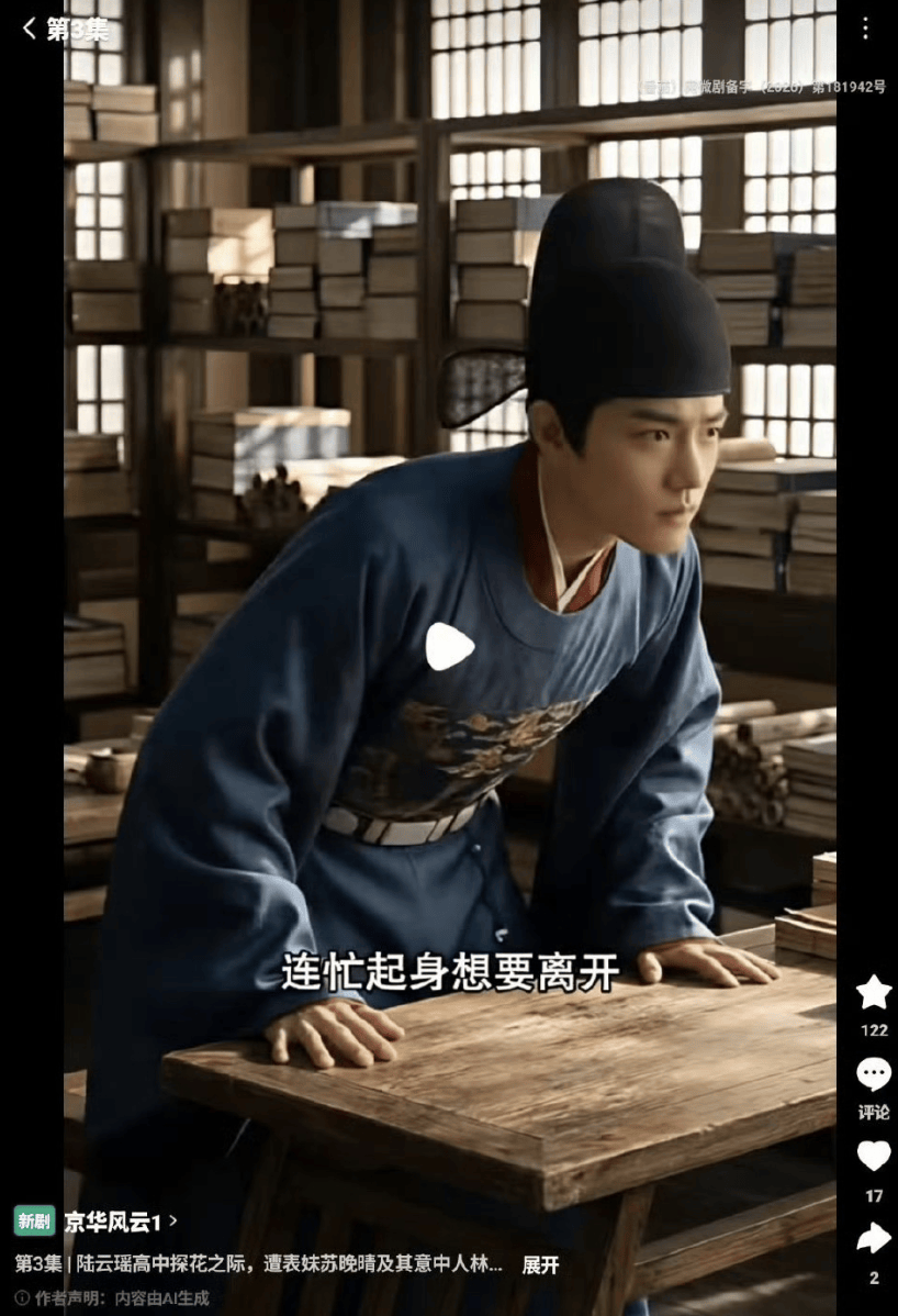 而在另一部叫做《京华风云》的AI短剧里,更是直接把肖战饰演的“藏海”给照搬了进去。