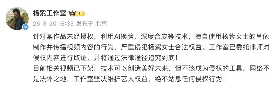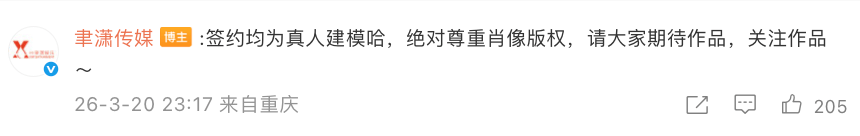 只是在评论区补充表示,签约的AI演员均使用的是真人建模,没有侵权其他艺人的肖像版权。