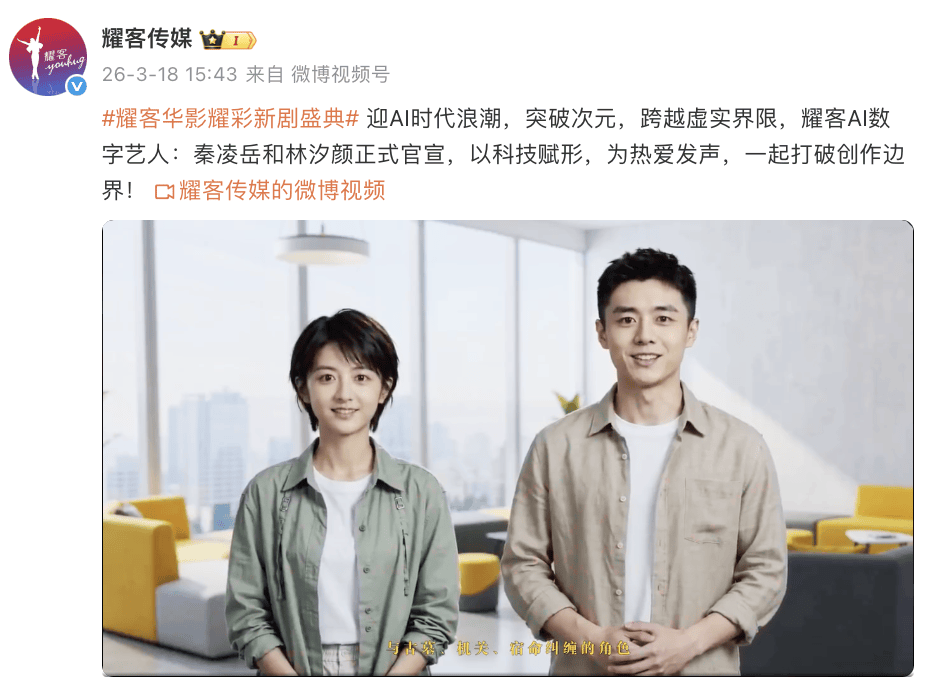 3月18日,头部影视公司耀客传媒正式官宣签约两位AI数字艺人,秦凌岳和林汐颜。