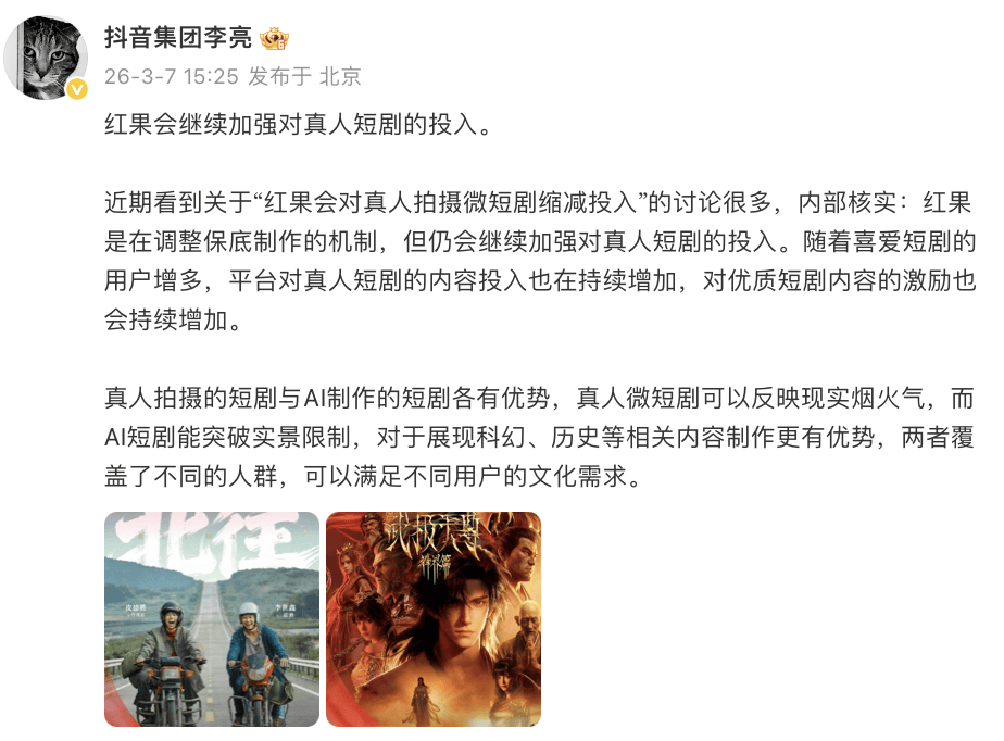 虽然抖音副总现身回应称会继续加强对真人短剧的投入,真人短剧与AI短剧各有优势,打算两手抓什么的......