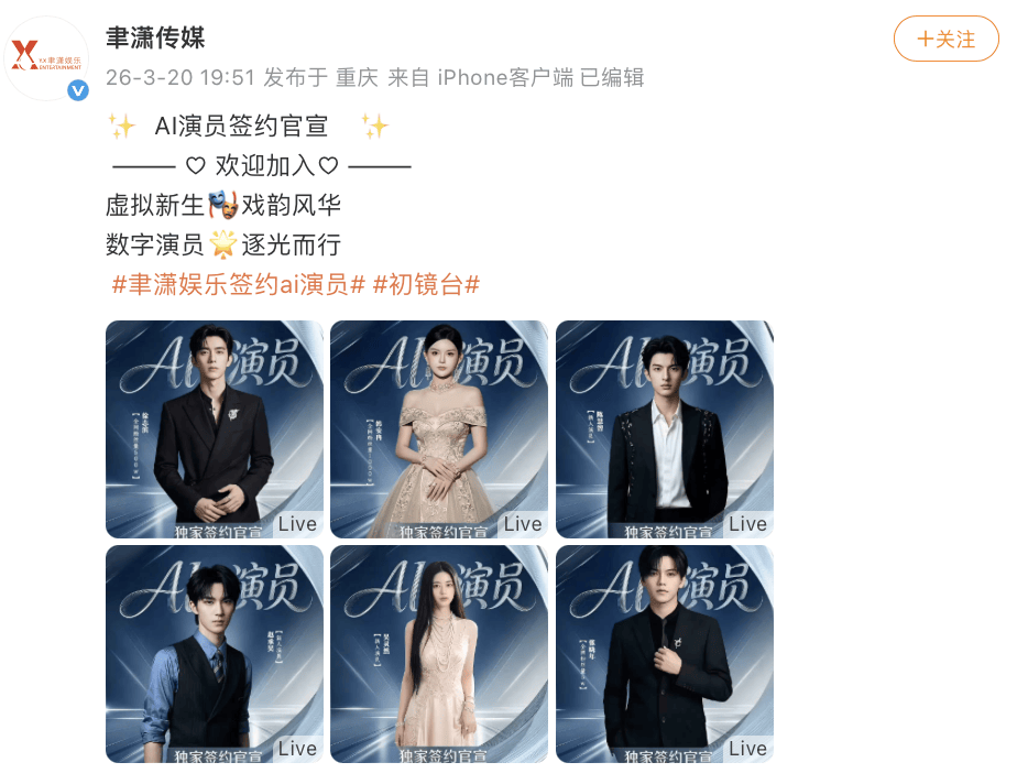 就在耀客当完出头鸟的第二天,聿潇传媒也一口气官宣了6名新签约的AI演员。